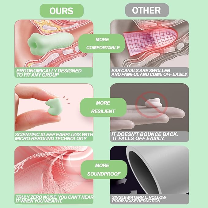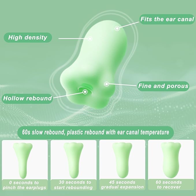 - 【Slow Rebound Design】: Our earplugs are crafted from ultra-soft memory foam that slowly rebounds within 60 seconds, molding perfectly to the shape and temperature of your ear canal. This personalized fit ensures long-term comfort without pressure or discomfort. Compared to traditional earplugs, our slow rebound memory foam earplugs offer enhanced stability, preventing slipping and providing reliable protection.